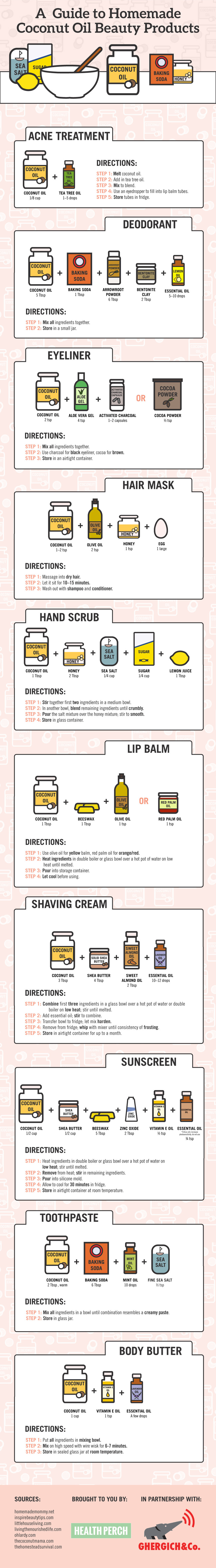 Luckily, our friends at Health Perch have made it easy in the infographic below. Coconut oil sunscreen, coconut oil eyeliner… the possibilities are (almost) endless!