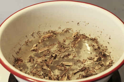 - Use a strainer to sieve out the dried roots as you poor into a teapot. Throw way the root pieces.
