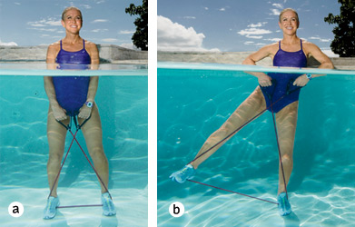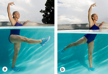 Put your left hand on the pool edge, your right hand extended overhead. Sweep your right leg forward to belly height (a) then sweep it behind you, squeezing your glutes (b). Continue for 30 seconds. Switch legs, and repeat for 30 seconds to complete 1 set.