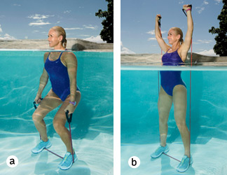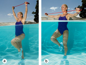 Start with your arms extended overhead, shoulder-width apart, one handle in each hand and band wrapped around your hands to reach the desired resistance. Lift your left knee (a). Lower your hands toward the water while pulling the band out to the sides, squeezing your shoulder blades together. Simultaneously switch legs, lifting your right knee (b). Repeat for 1 minute to complete 1 set.