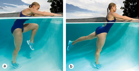 Stand 2 feet away from the pool side, your feet hip-width apart and your hands resting on the wall. Draw your left knee to your chest, rounding your back and contracting your abs (a). Extend your leg behind you, squeezing your glutes (b). Continue for 30 seconds. Switch legs, and repeat for 30 seconds to complete 1 set.